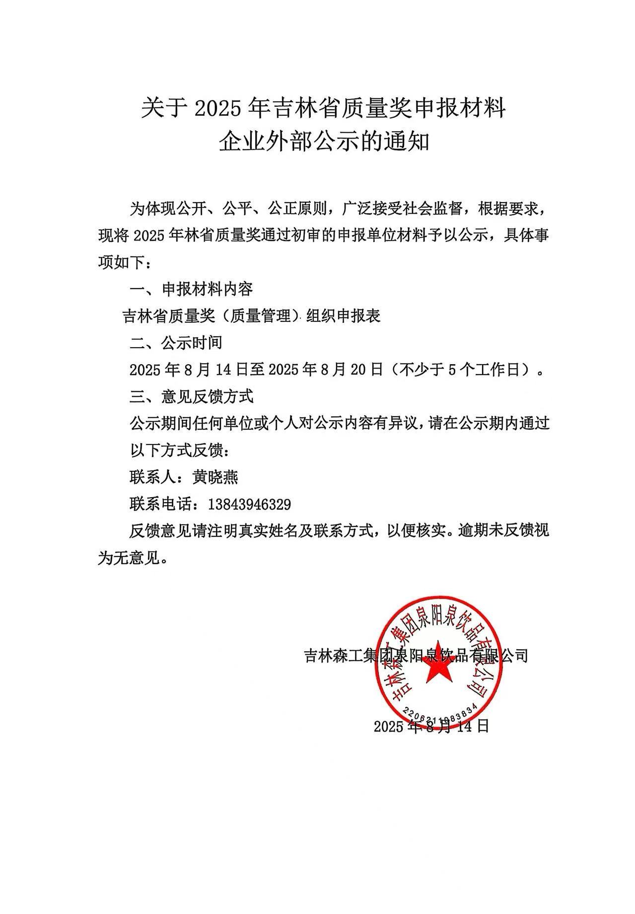 關(guān)于2025年吉林省質(zhì)量獎申報(bào)材料企業(yè)外部公示的通知